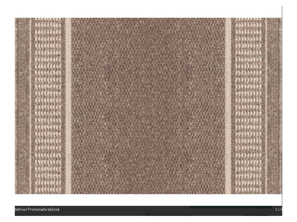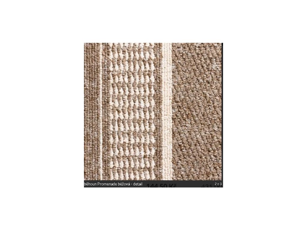 Kobercový běhoun Promenade je vyroben z polypropylenového vlákna tkaného do smyčky se zajímavým vzorem bordury. Promenade svým provedením dokáže nejen dobře vypadat, ale také zvyšovat čistotu a tím chránit ostatní krytiny. V aktuální nabídce naleznete pouze nejprodávanější barvu na našem trhu - béžový povrch s prosvětlenou bordurou.