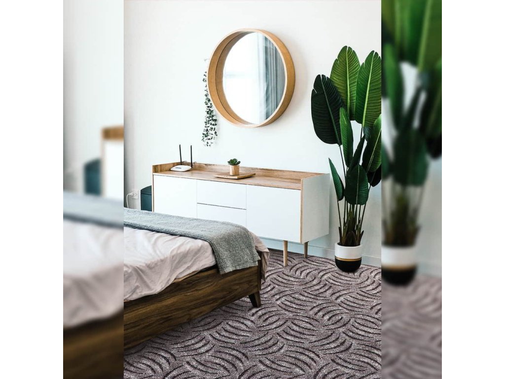 Riverton je typ uzlíkového koberce Scroll, což znamená, že má vyšší i nižší uzlík co vytváří jeho vzor a odspodu má filc, který tlumí hluk a izoluje teplo. Je vyroben z polyamidu a celková tloušťka koberce je 9mm. Své využití nachází v ložnicích či obývácích. Tento hnědý odstín se šedým nádechem ocení zejména milovníci přírodních a zemitých barev. Jeho vlnitý geometrický vzor tento dojem ještě umocňuje. materiál 100% polyamid Výška vlasů: 7 mm Celková výška koberce: 9 mm Hustota tkáně: 189000 vpíchů/m2 Celková hmotnost koberce: 1210 g/m2 Třída zatížení: 22 Podklad: Filc